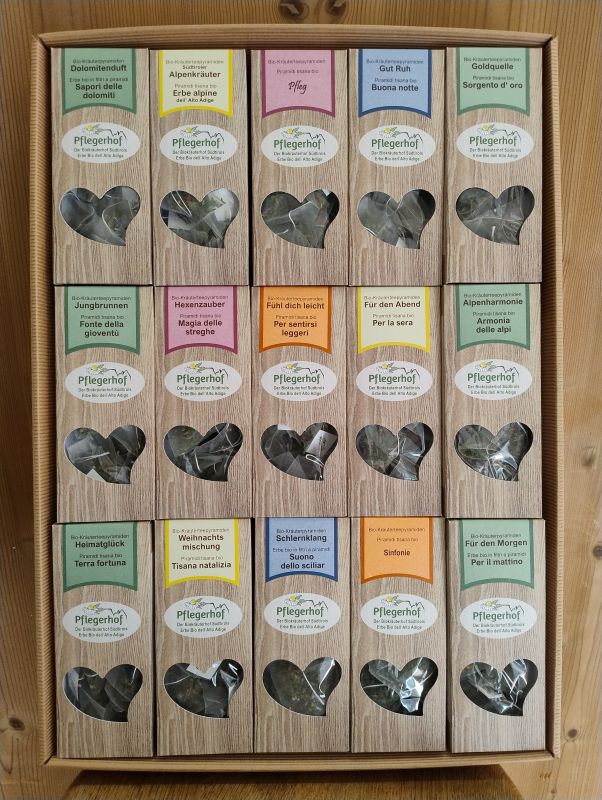 Geschenkkarton mit 15 schmackhaften Kräuterteemischungen im Pyramidenbeutel a 9Stück